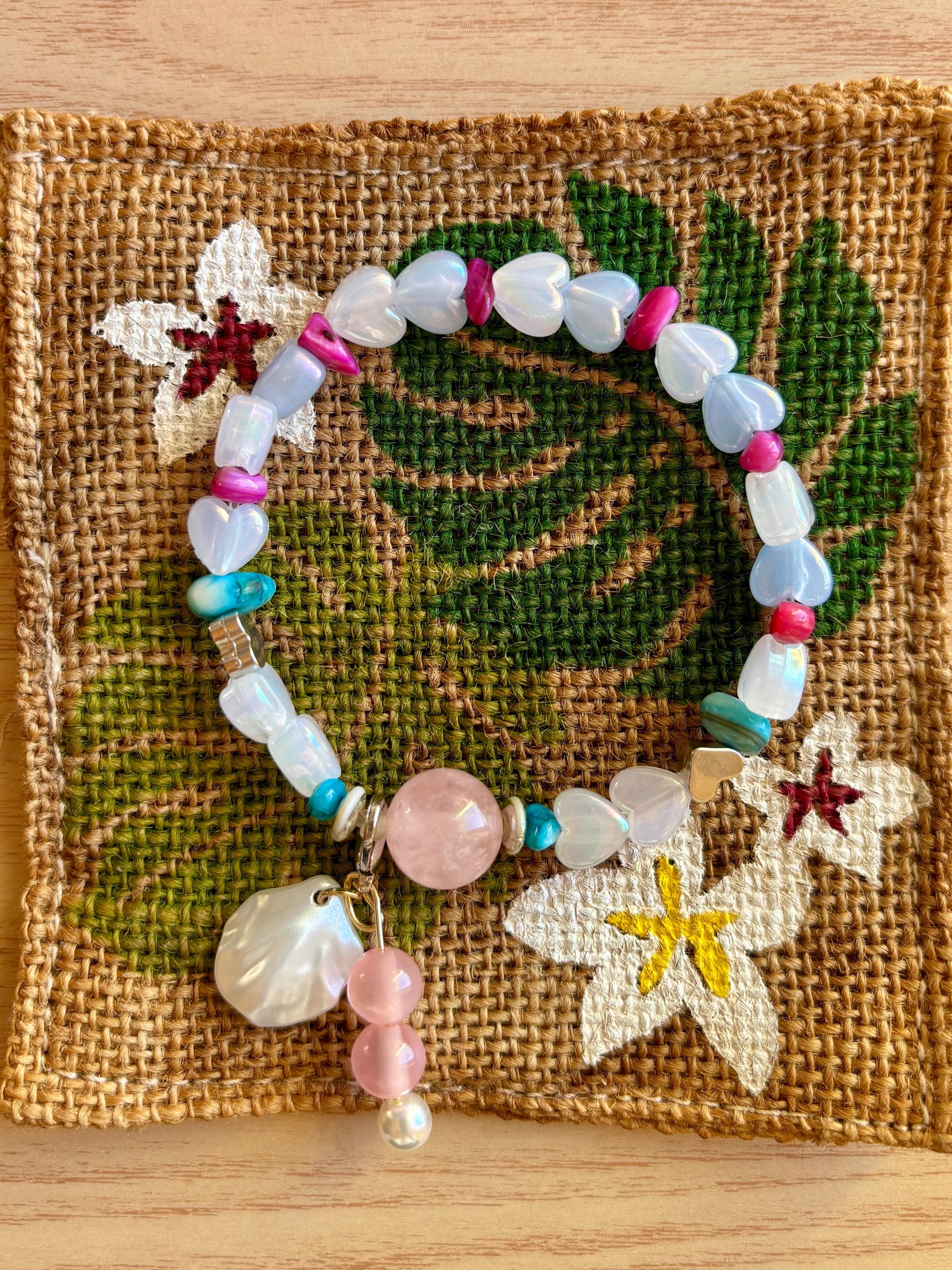 このブレスレットの大きなイメージはやはり「愛」なのでビーズの材料はハート♡型にこだわり製作しています
